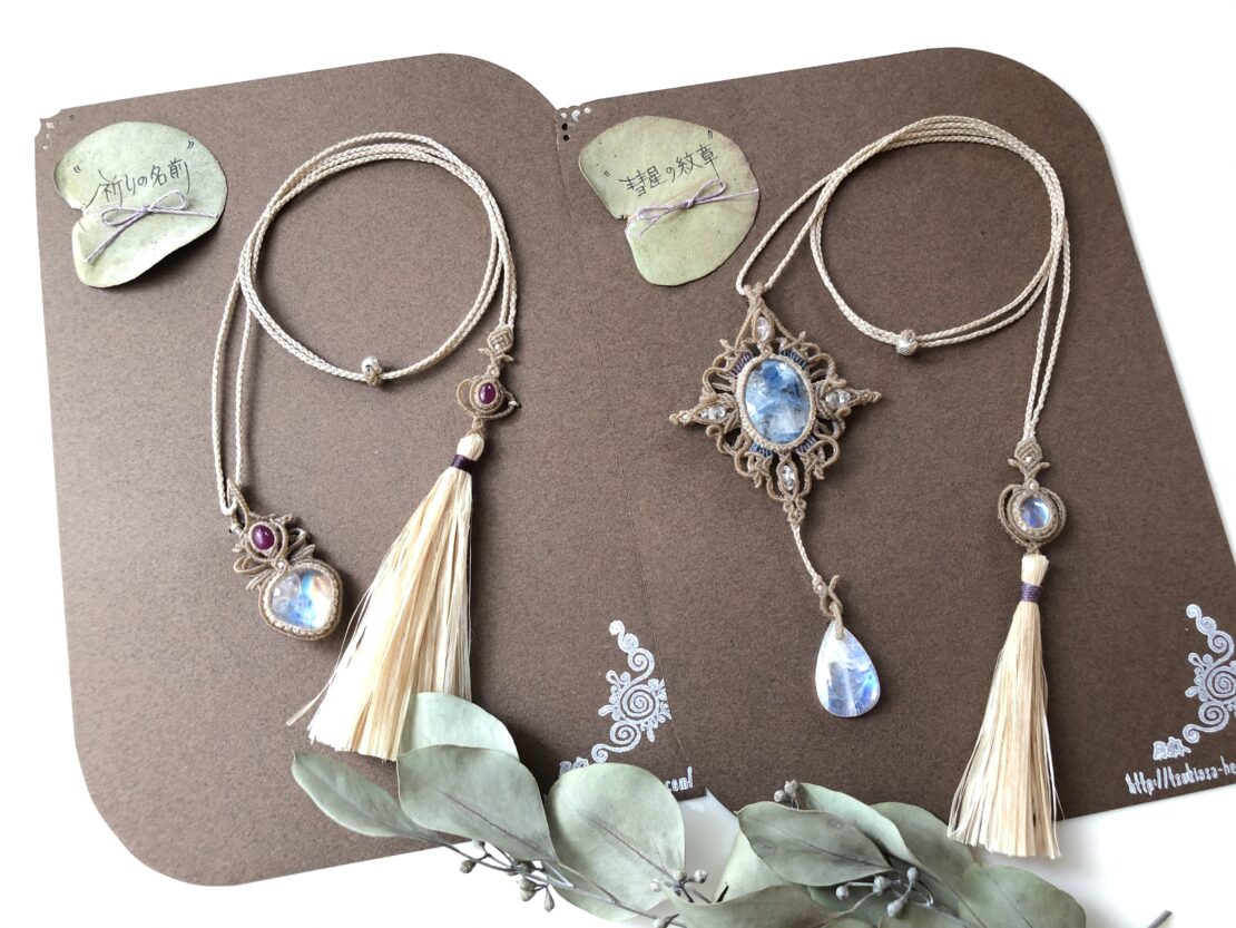 そう思いつつも数年その想いを放置し、20代半ばになりふと「あ、そういえばヘンプアクセサリー作ってみたいな」と思い立ち本屋に走ったが最後、見事どハマりし、楽しい!面白い!の一心で作品は増えていき、気づけば仲間ができアートフリマに出すようになったり委託販売をするようになりました。