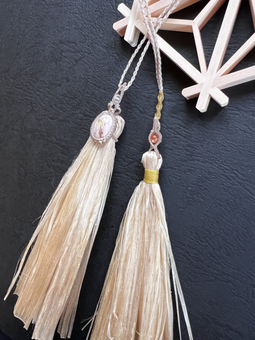 精麻のタッセルが長い場合には、切れるハサミを使いお好みの長さに切っていただけます。