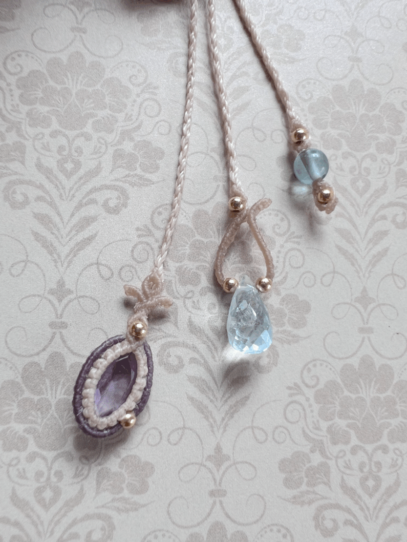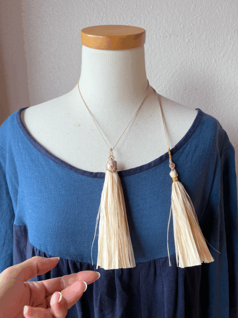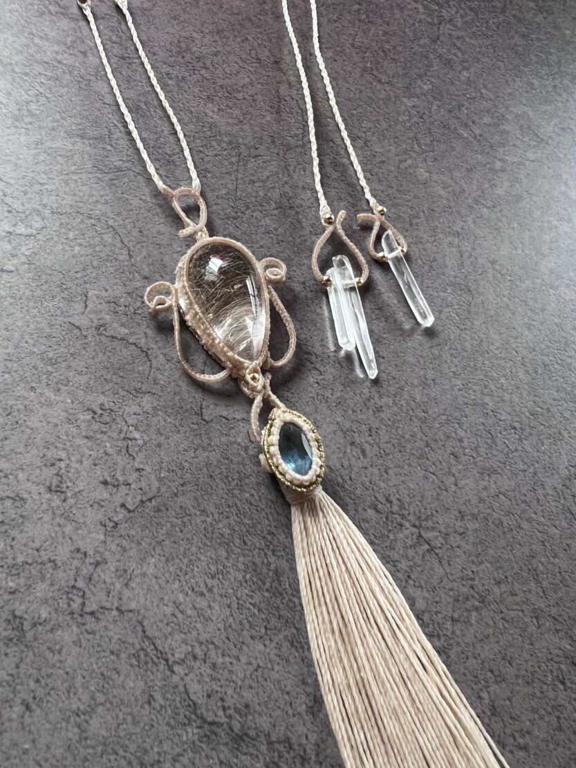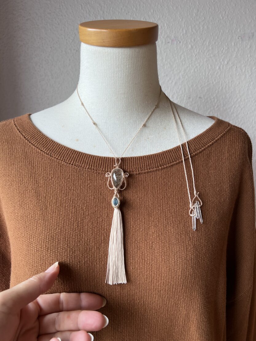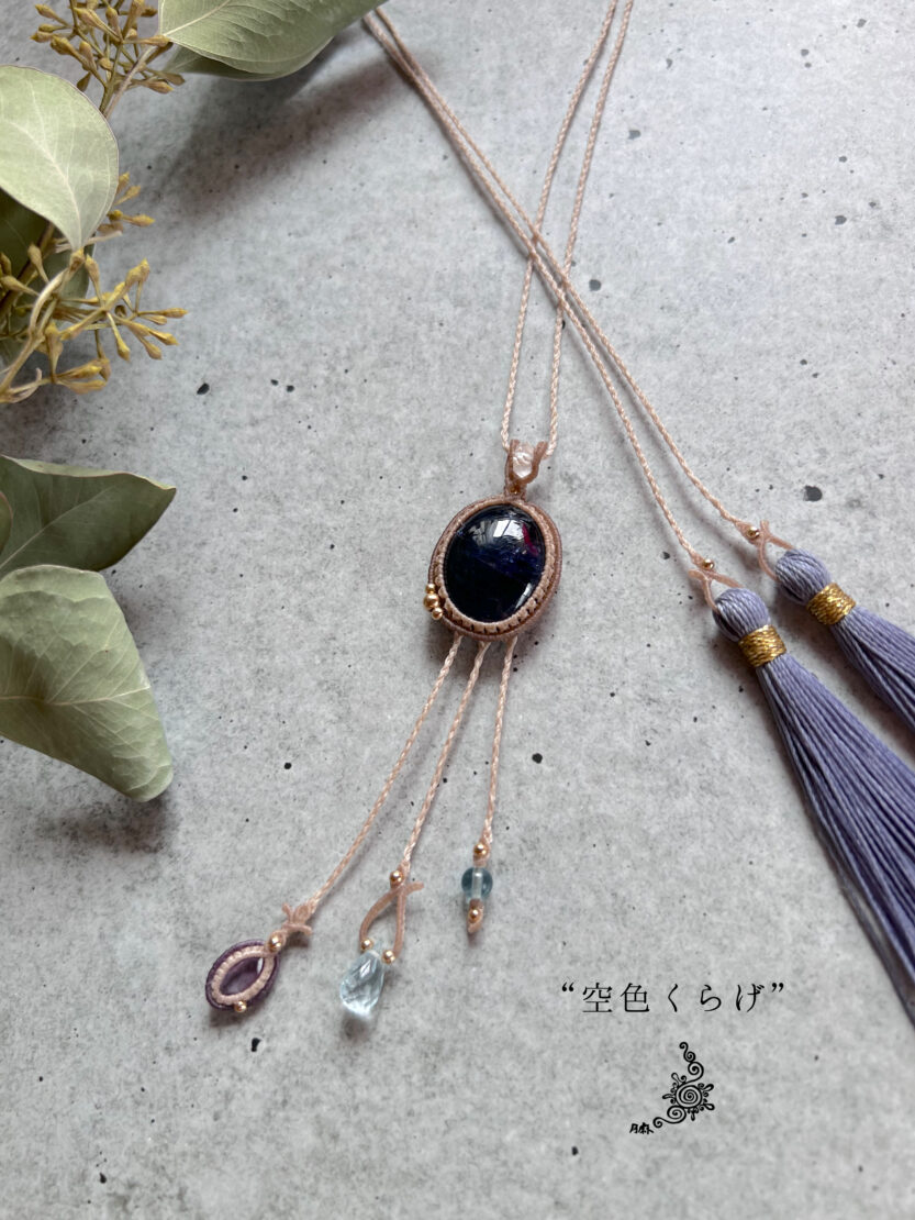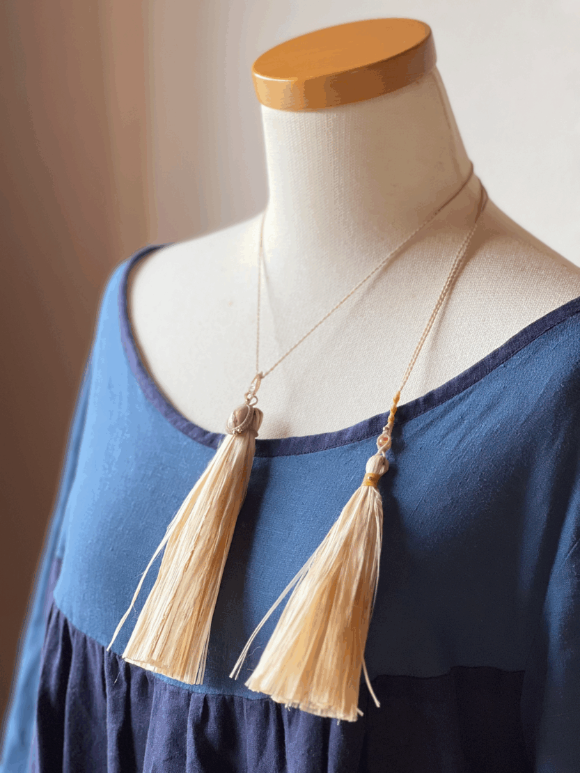 細い細い紐とそれよりやや太めの紐で仕上げた、繊細なつくりが美しい首飾りのお披露目です。