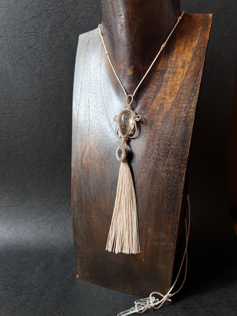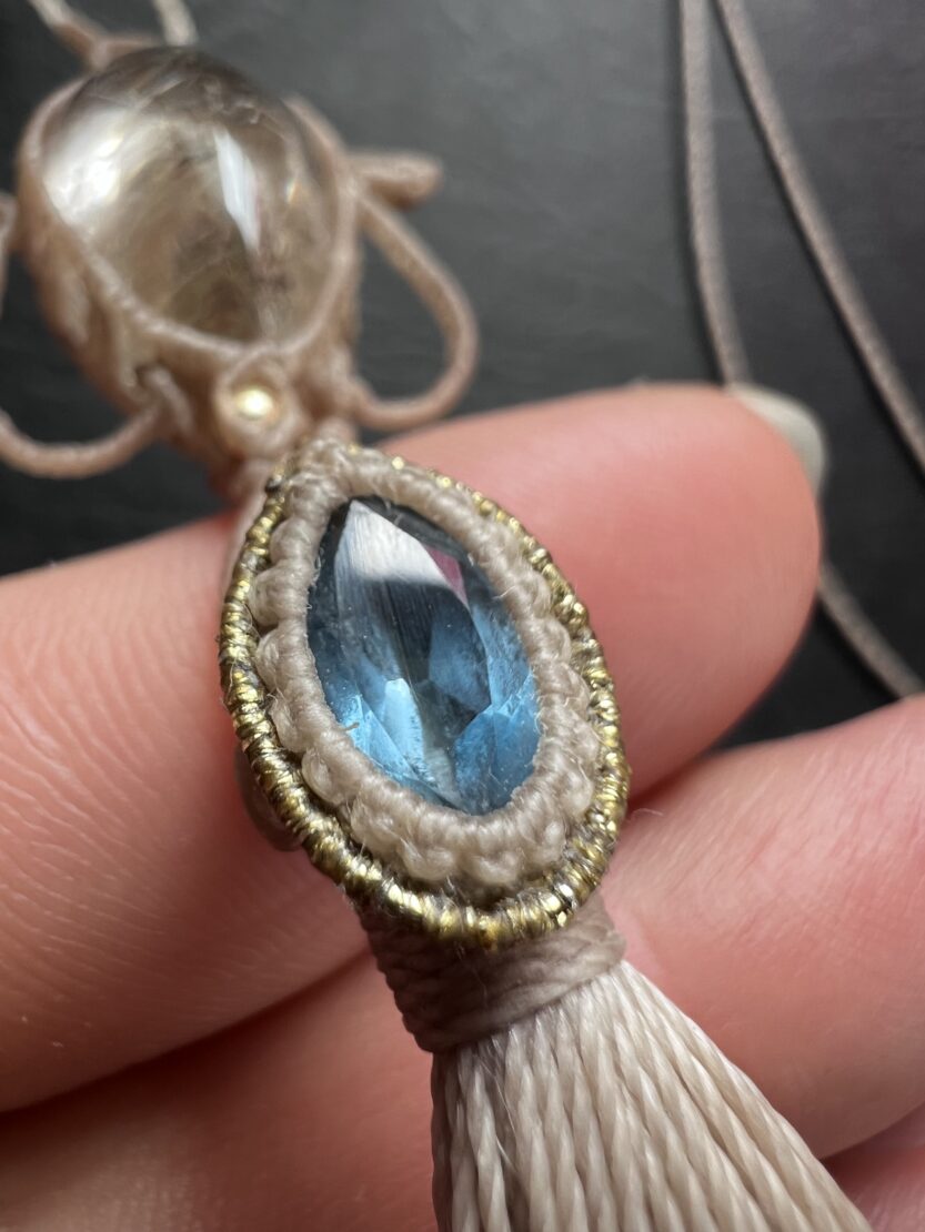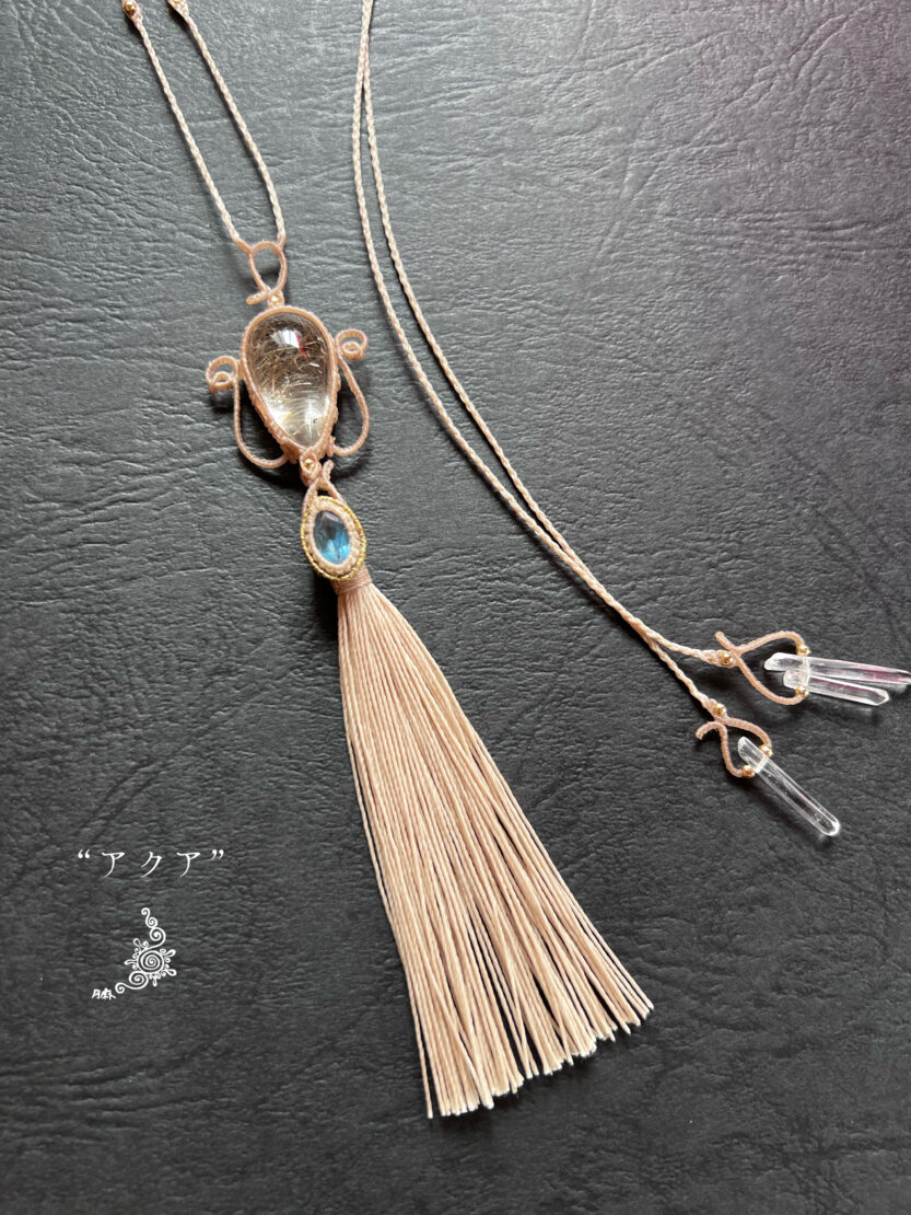 ぷっくりと愛らしいルチルクォーツを主役に、下部のタッセル部分にはロンドンブルートパーズの美しくカットされたpieceにて色彩のポイントを。