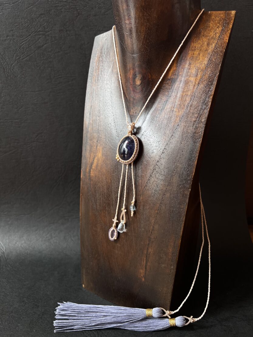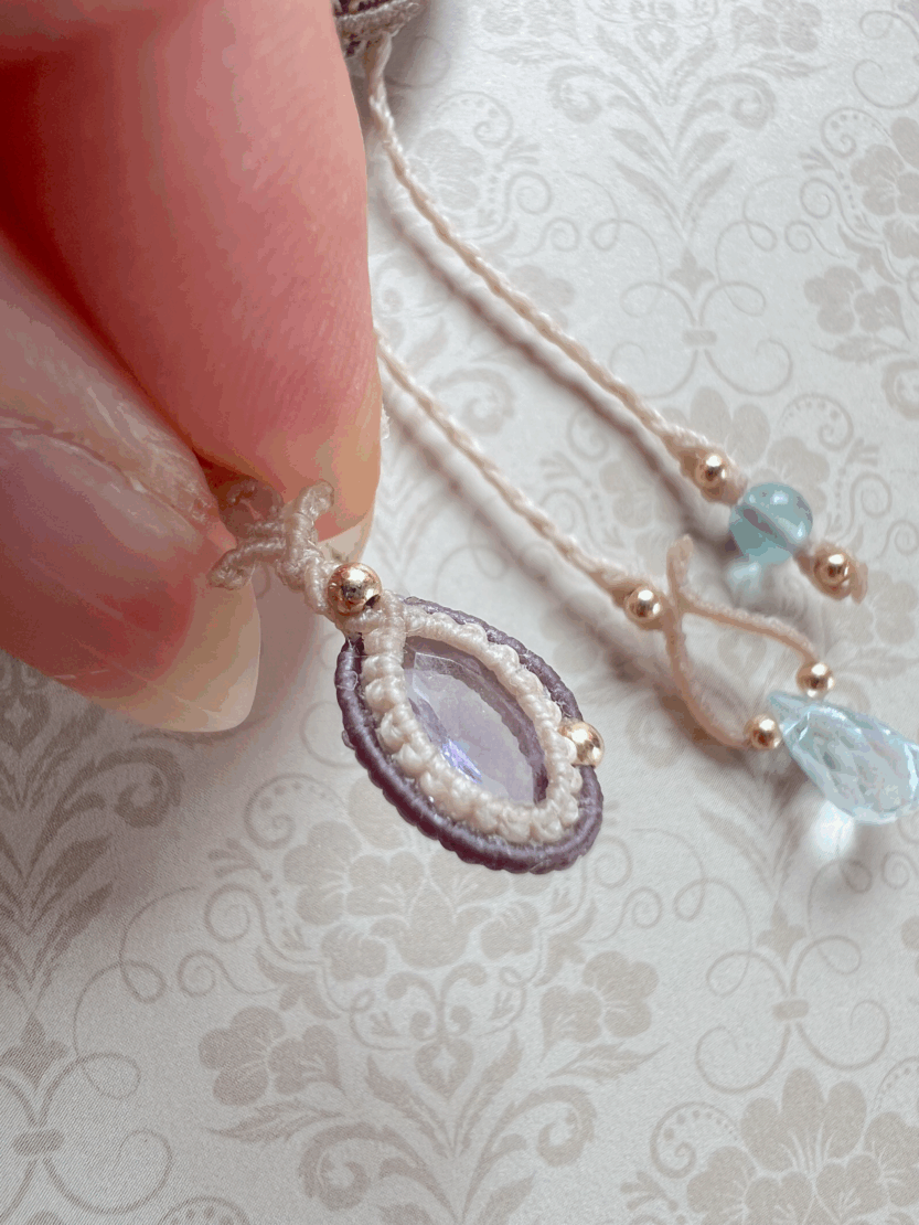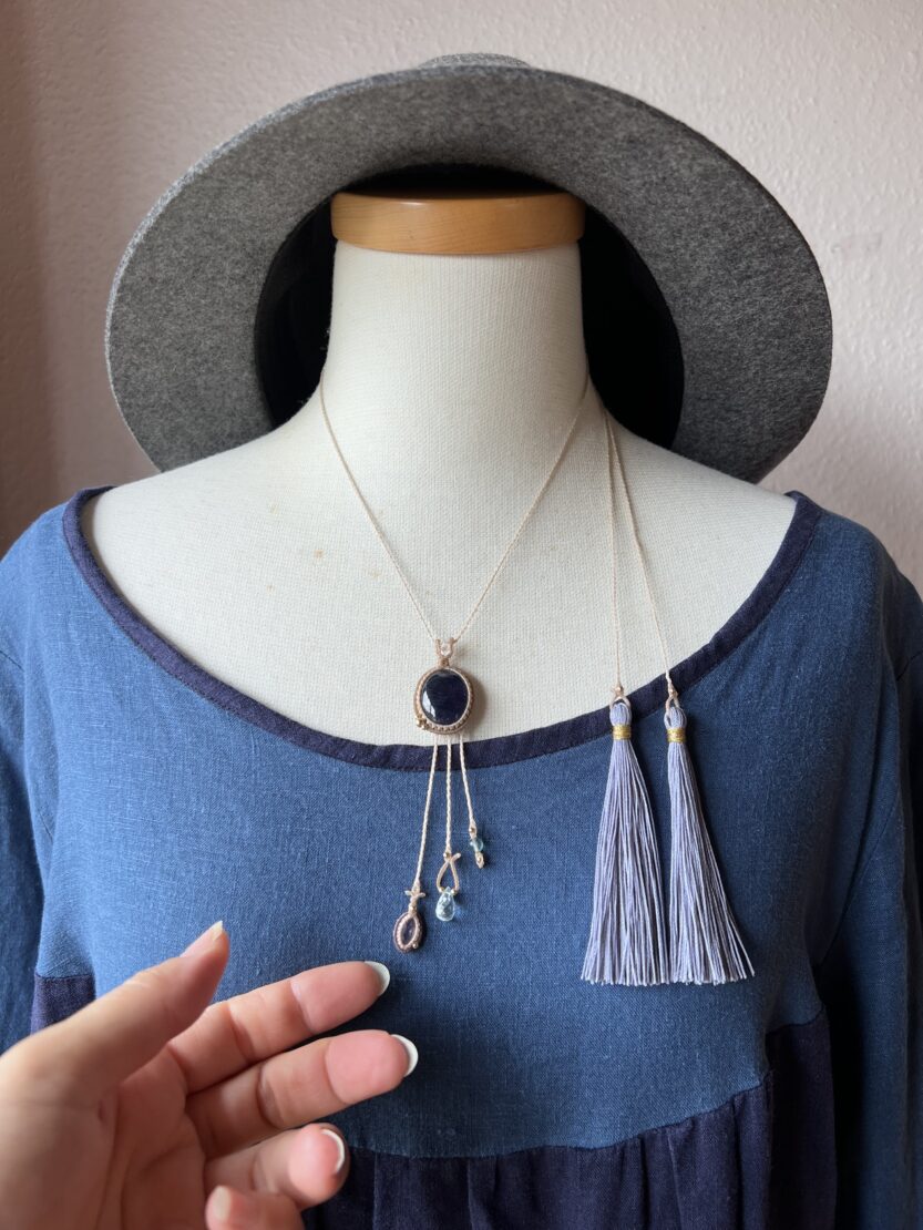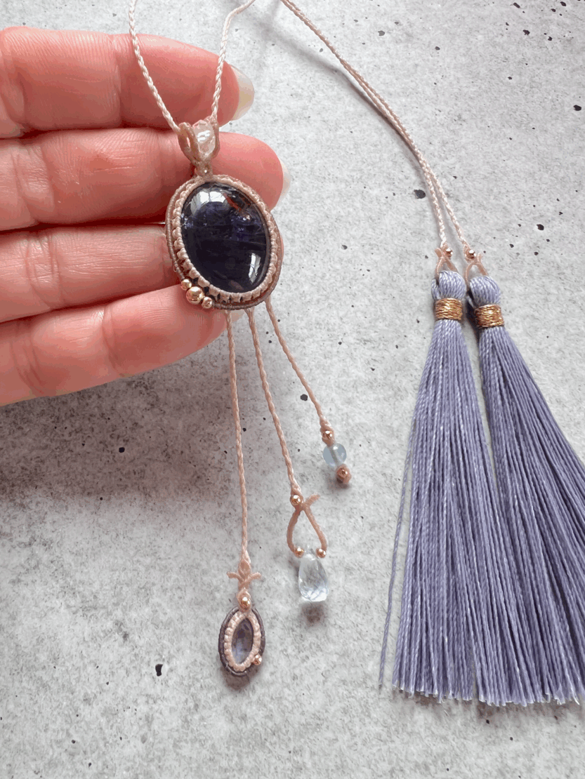 背守りのタッセルもトップのアイオライトに合わせてすみれ色の紐で。