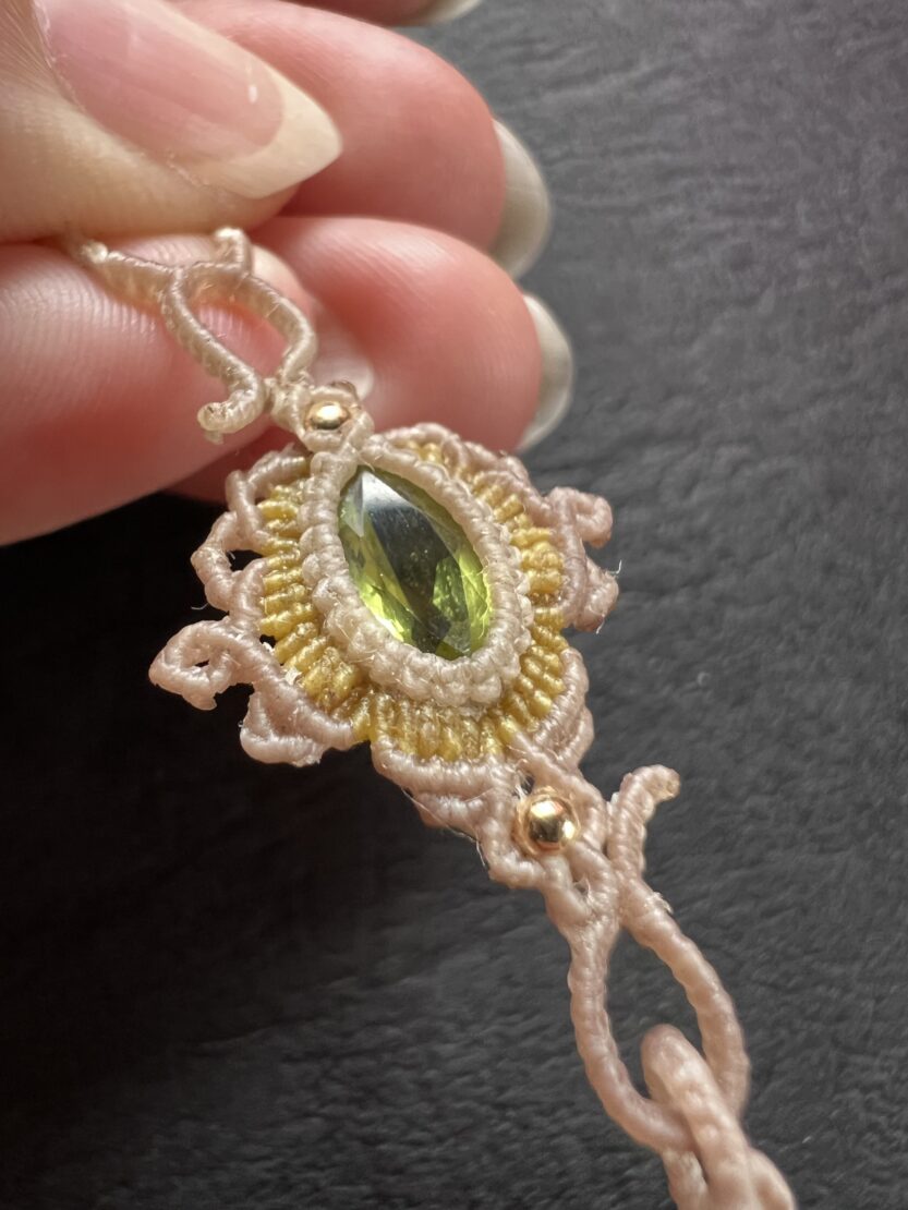 背守りも愛らしく、ペリドットビーズとタッセルで纏めました。
