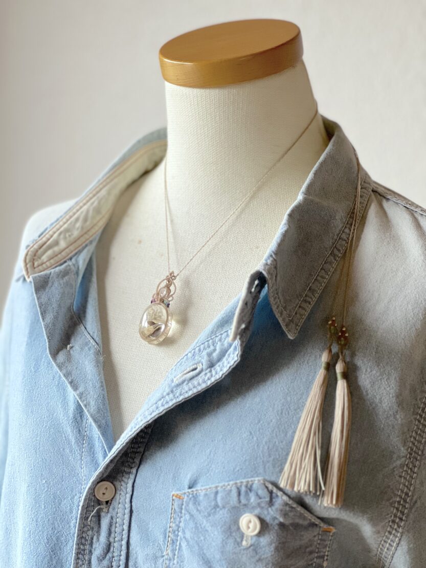 背守りにも野州麻の精麻をあしらった、前からも後ろからも守ってくれる“身に着ける御守り”な首飾りです。
