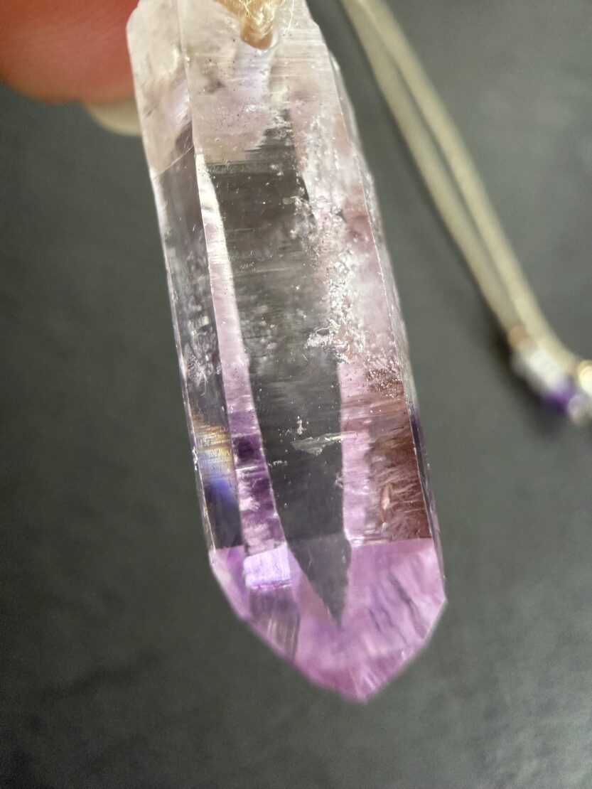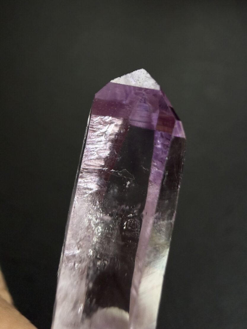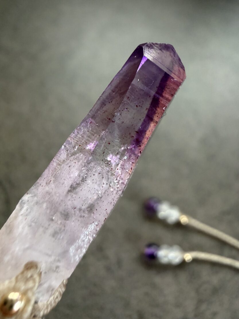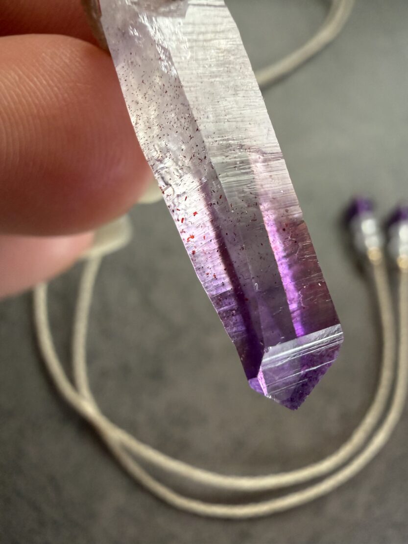先端近くには、内部に赤色がキラキラ煌めくレピドライトが内包されています。