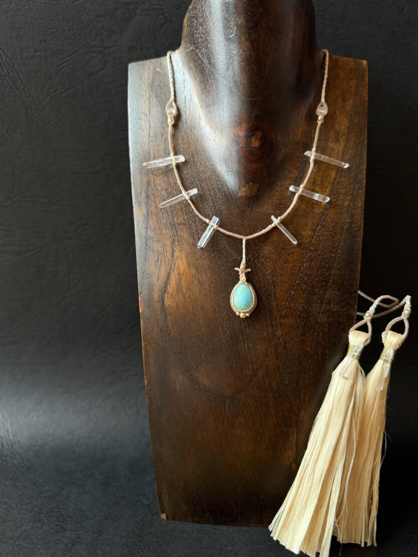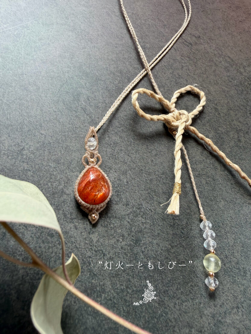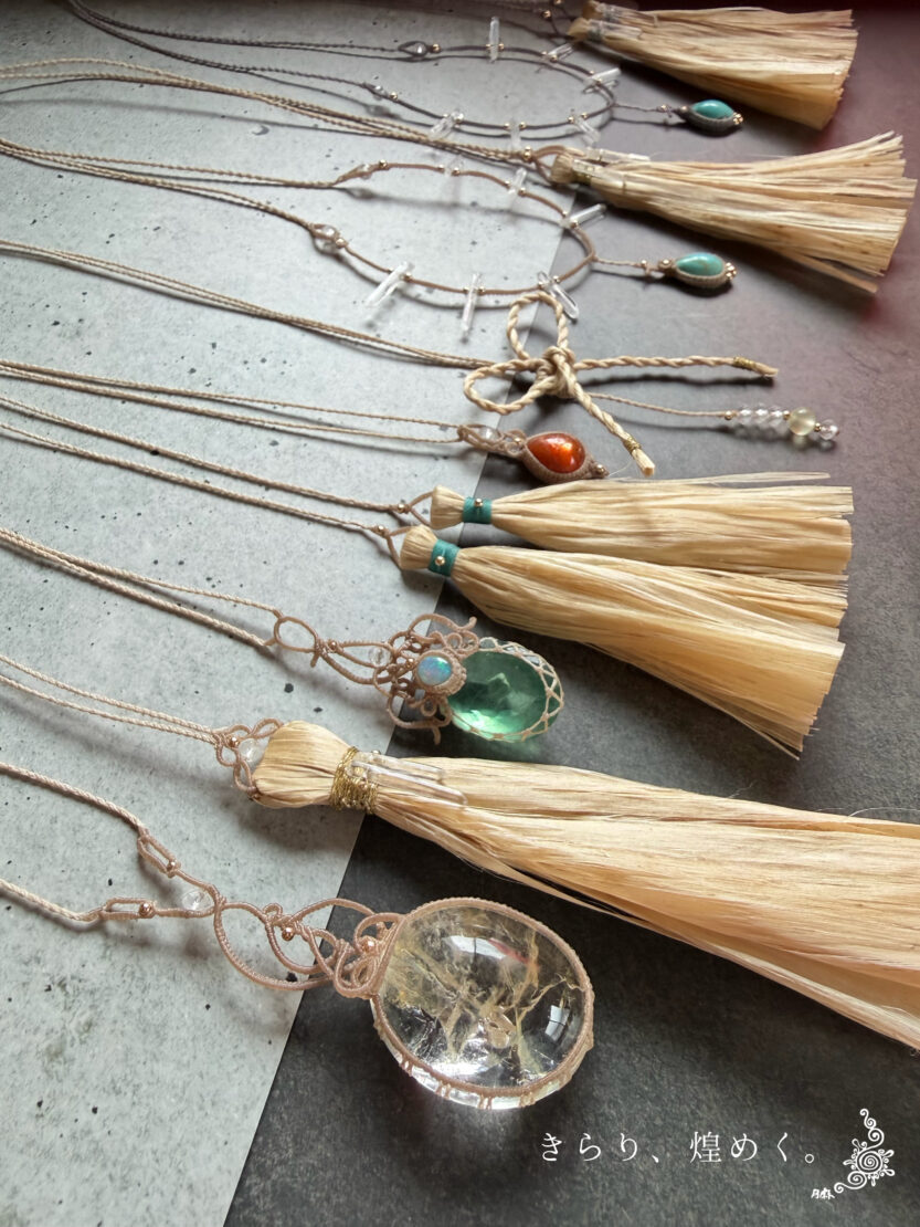 野州麻の精麻×天然石×マクラメの月麻定番の組み合わせによるアクセサリーたち。