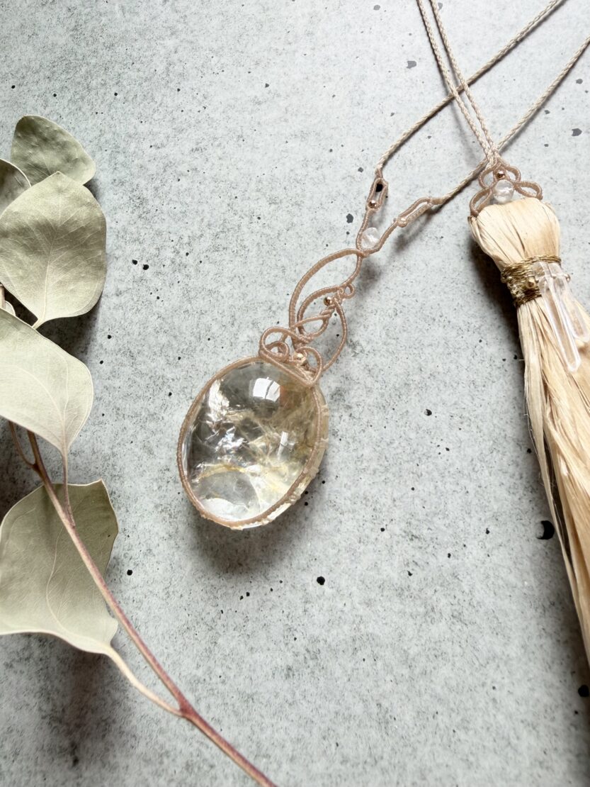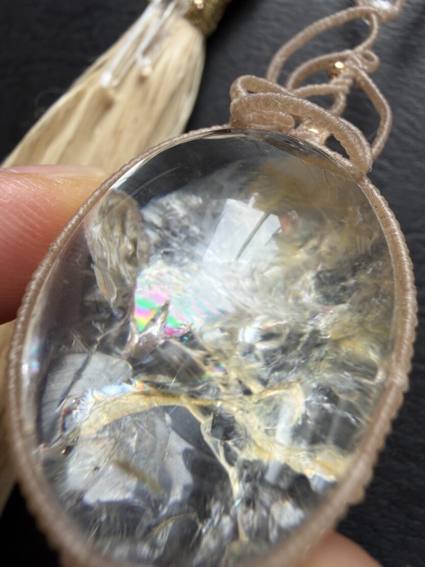 かなり大粒の虹入りガーデンクォーツをベージュ色の蝋引き紐にて曲線を描いたデザインに。