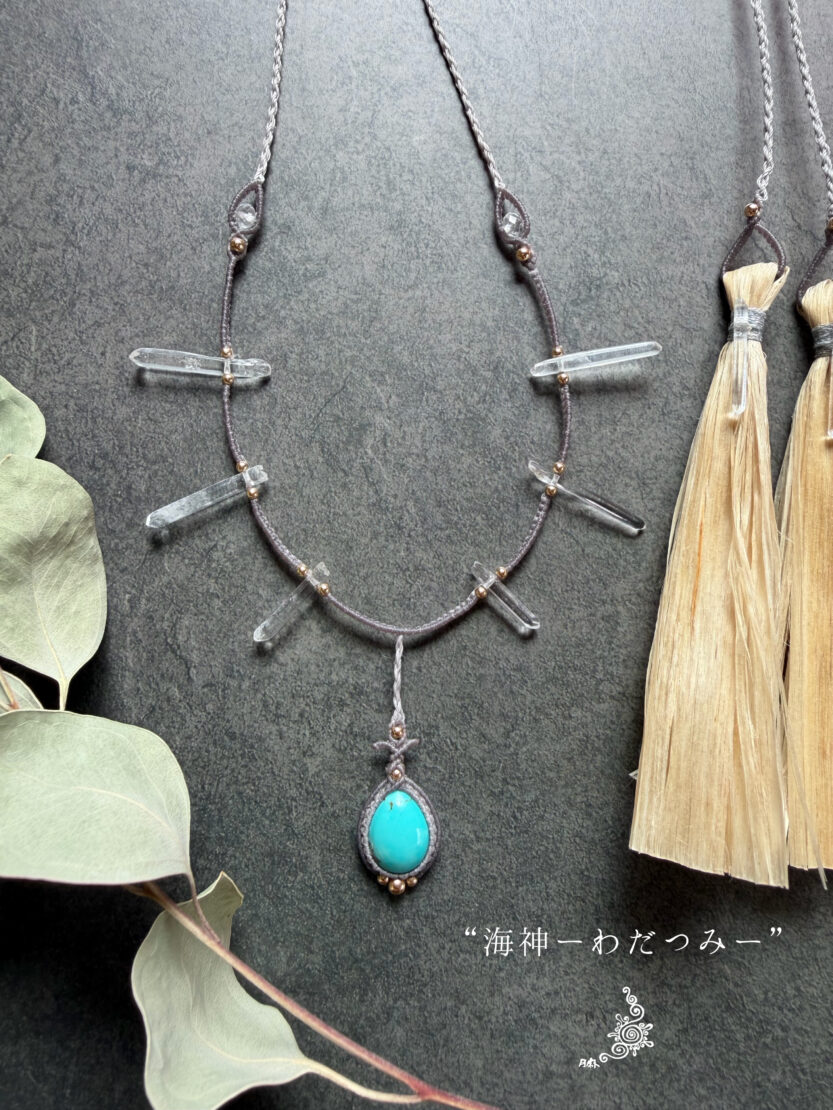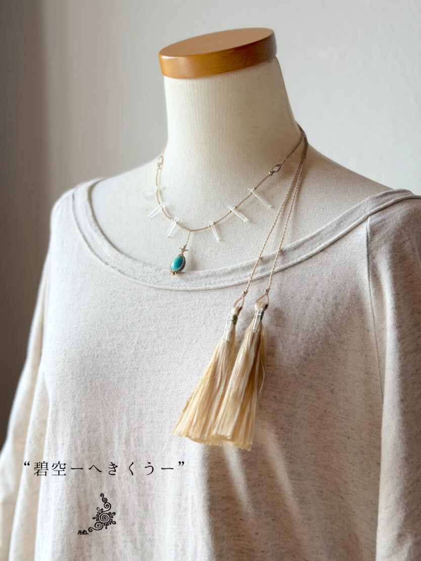 首周りにはマダガスカル産の研磨済みポイント水晶をあしらってどこかプリミティブな印象に。